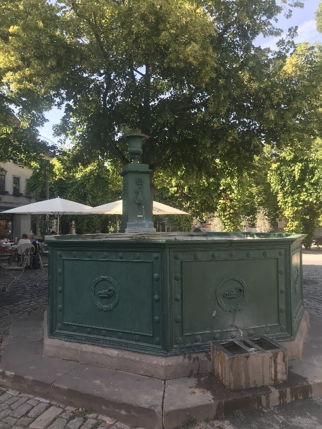 Entstanden ist der Brunnen in der Zeit der Romantik. Auffällig am Brunnen ist das klassizistische Gefäß, ein Krater. Des Weiteren befinden sich an den Eisenplatten an den Seiten Verzierungen in Form von Schlangen. Dies ist ein Ausdruck aus der Romantik.